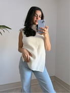 Elevate your wardrobe with the Sadie Sleeveless Turtleneck Sweater in cream, a chic and versatile piece that effortlessly combines style and comfort. Crafted from a soft, ribbed knit fabric, this sleeveless turtleneck offers a flattering fit and a cozy feel, making it perfect for layering or wearing on its own. The high-neck turtleneck design adds a touch of sophistication, while the creamy hue provides a timeless, neutral base that pairs effortlessly with jeans, skirts, or tailored trousers.